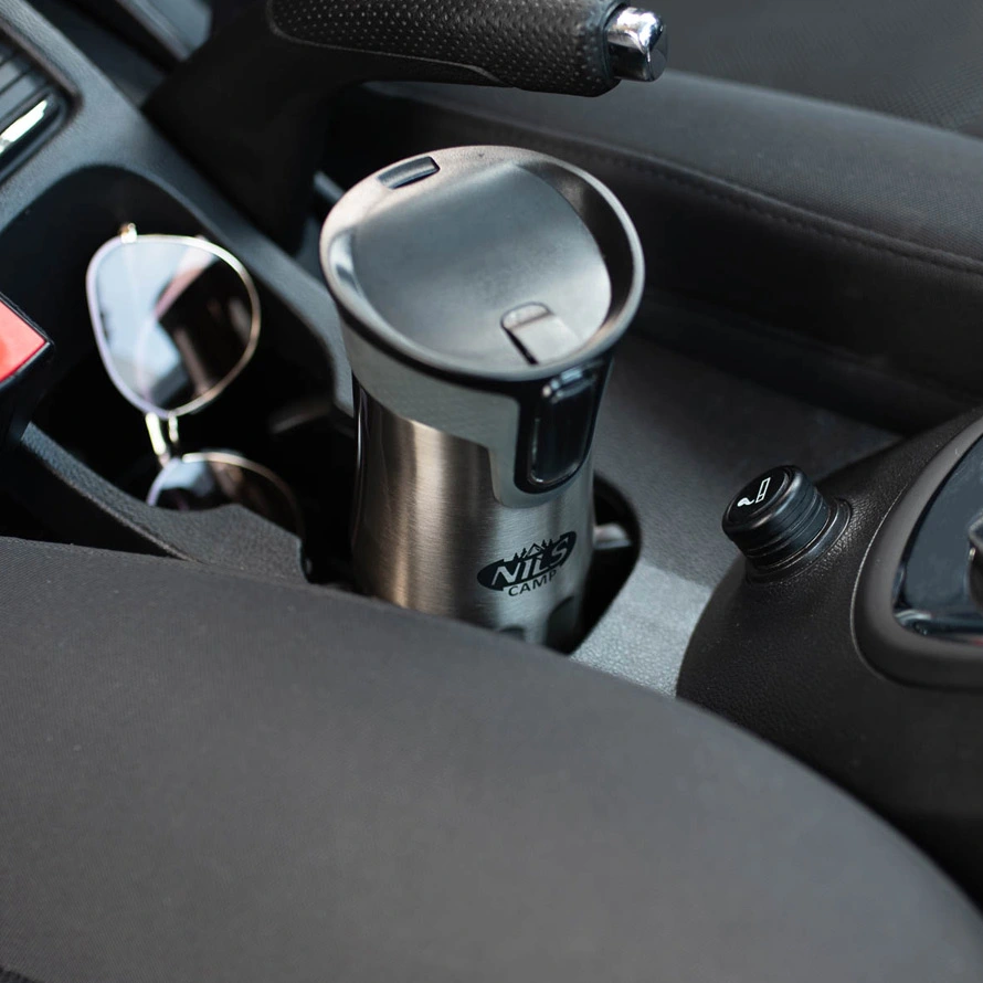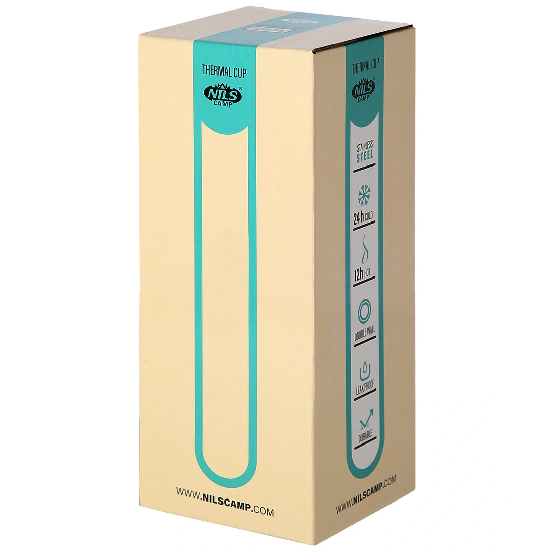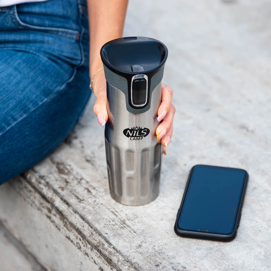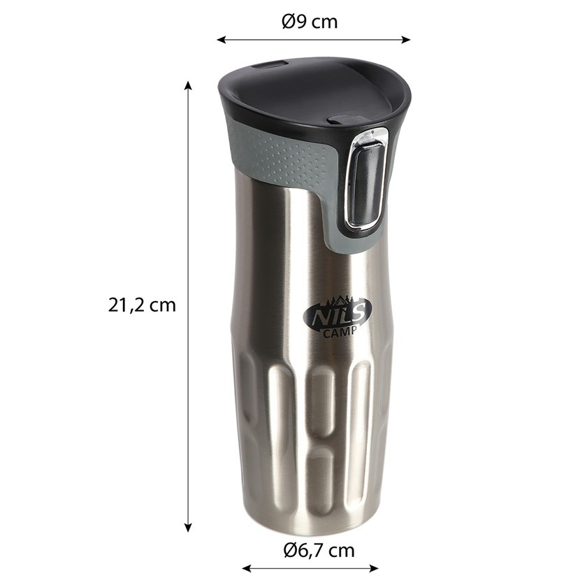 Cană termică NILS CAMP NCC06 SILVER din oțel inoxidabil cu pereți dubli: păstrează cald până la 12 ore și rece până la 24 ore. Sistem de deschidere cu buton (apeși — bei, eliberezi — se închide), bază antiderapantă și zonă de prindere reliefată; capacitate 420 ml.