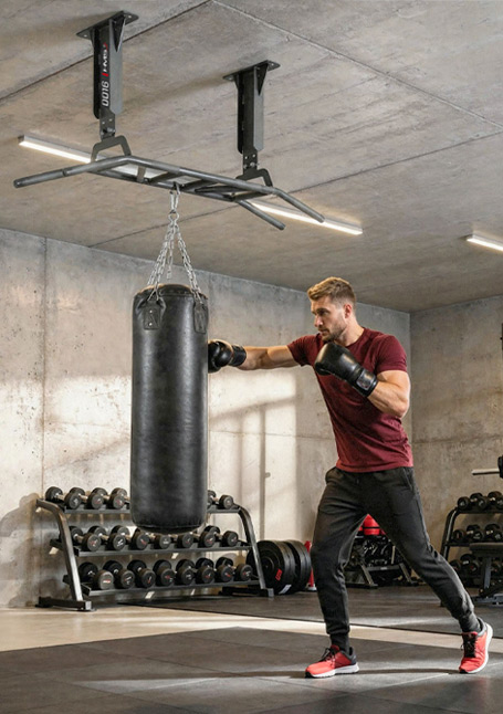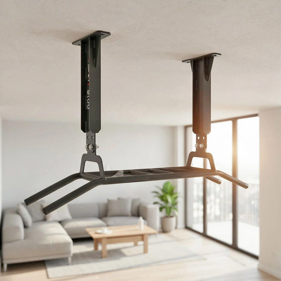 Opțiuni de montare: construcția permite 2 variante de instalare: pe perete sau pe tavan. Montarea pe perete este potrivită pentru zonele obișnuite de antrenament acasă, iar montarea pe tavan economisește spațiu și oferă mai multă libertate de mișcare. Construcție și priză: bara este realizată din oțel rezistent. Mânerele sunt poziționate pentru mai multe variante de priză, iar finisajul antiderapant contribuie la o utilizare mai sigură în timpul exercițiilor.