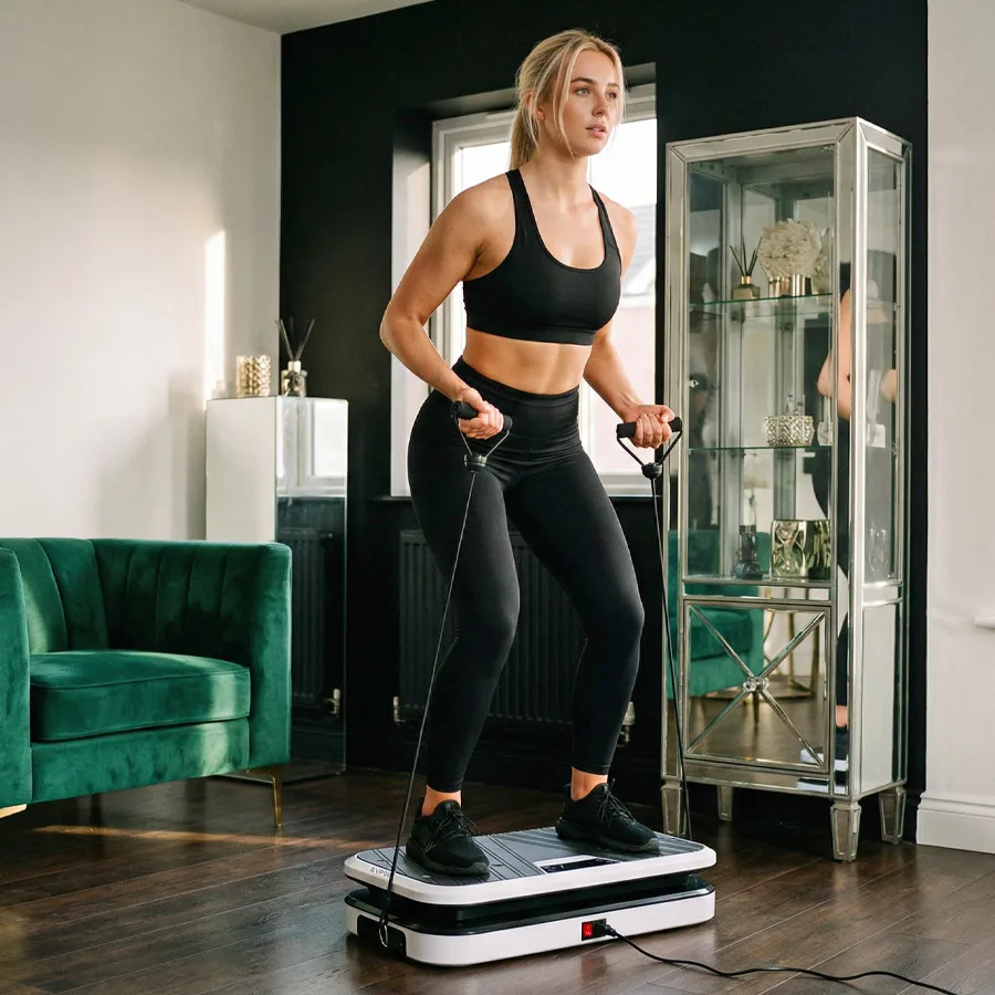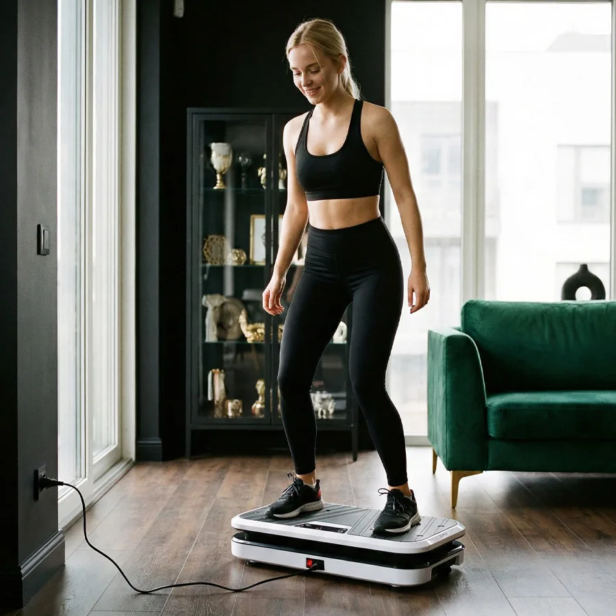 Setul include platforma vibrațională, telecomanda, benzile de rezistență pentru brațe, barele pentru flotări, cablul de alimentare și manualul de utilizare. Înainte de utilizare, producătorul recomandă citirea atentă a instrucțiunilor. Manualul precizează separat că în caz de sarcină, stimulator cardiac sau alte probleme de sănătate este recomandat consultul medical înainte de antrenament.