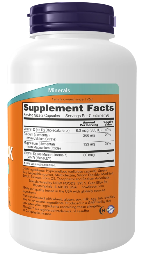 Calciul și magneziul sunt minerale cunoscute ca fiind necesare pentru sănătatea oaselor. Alături de aceste două minerale importante, NOW® Cal-Mag DK Caps conține vitaminele D și K. Vitamina D3, o vitamină liposolubilă, joacă un rol important în metabolismul țesutului osos, precum și în absorbția calciului și magneziului la nivel intestinal. Vitamina K2 este un nutrient care susține suplimentar sănătatea oaselor, participând la procesul de calcificare normală a țesutului osos.