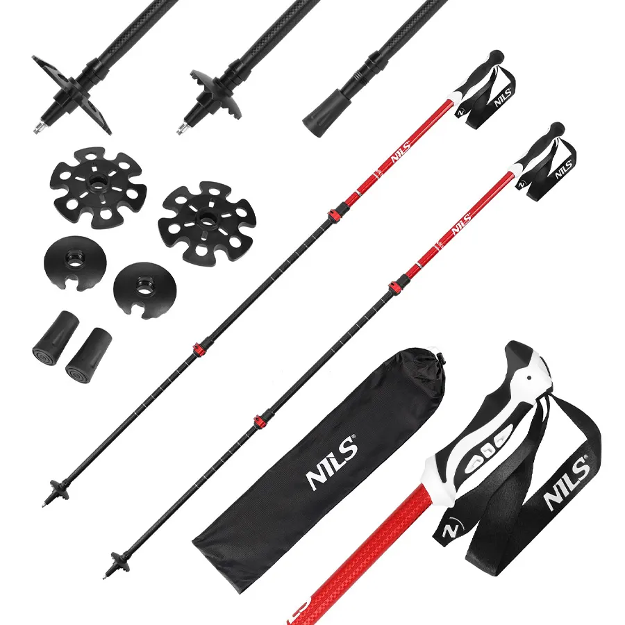 Рукоятка и темляки: рукоятка выполнена из пластика, предусмотрены регулируемые ремешки на рукоятке для более удобной посадки на кисти. Насадки и комплектация: в комплекте идут два набора колец (стандартные и увеличенные для ходьбы по снегу), а также чехол для хранения и переноски.