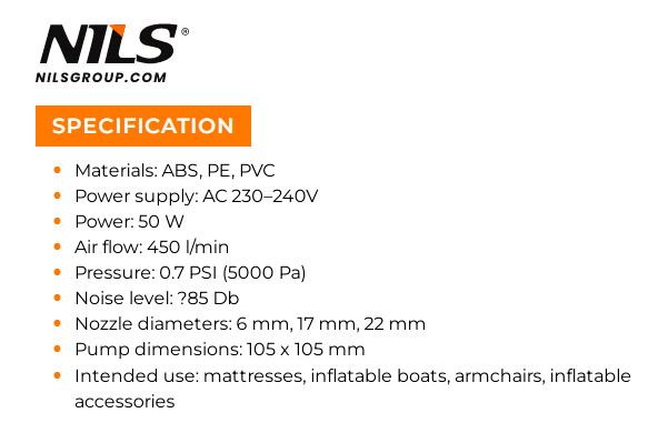 Эффективность и функциональность: производительность устройства достигает 450 литров в минуту, что позволяет быстро накачивать даже самые крупные надувные изделия. Рабочее давление обеспечивает необходимую жёсткость надуваемых изделий, а максимальный уровень шума не превышает 85 дБ, что делает насос удобным для повседневного использования.