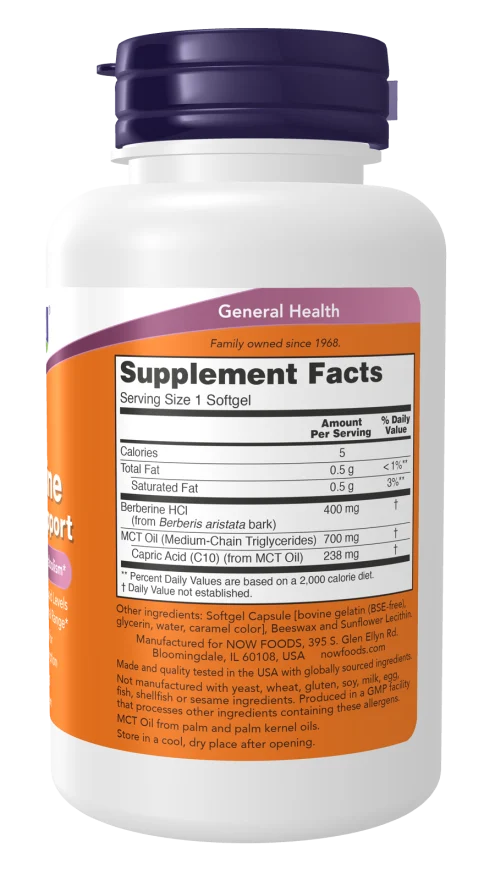 Берберин — это натуральный компонент таких растений, как гидрастис, орегонский виноград и барбарис. Клинические исследования показали, что берберин способствует поддержанию уже нормального метаболизма глюкозы и липидов. Поскольку берберин известен своей ограниченной биодоступностью, в состав этого продукта включена каприновая кислота (C10, среднецепочечный триглицерид), чтобы способствовать оптимальному усвоению и поддержанию комфорта желудочно-кишечного тракта во время приема берберина. Не содержит молока, яиц, глютена и сои; соответствует стандарту халяль.