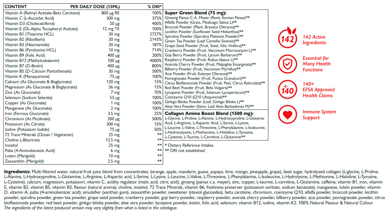 Вода (очищенная несколькими фильтрами), натуральная фруктовая смесь соков из концентратов: (апельсин, яблоко, мандарин, гуава, папайя, лайм, манго, ананас, виноград), свекольный сахар, гидролизованный коллаген (L-глицин, L-пролин, L-аланин, L-гидроксипролин, L-глутамин, L-аргинин, L-аспарагиновая кислота, L-серин, L-лизин, L-лейцин, L-валин, L-треонин, L-фенилаланин, L-изолейцин, L-гидроксилизин, L-метионин, L-гистидин, L-тирозин, L-цистеин), кальций, магний, калий, витамин C, регулятор кислотности (яблочная кислота, лимонная кислота), женьшень (panax c.a. meyer), цинк, медь, L-таурин, L-карнитин, L-глутамин, кофеин, витамин B1, железо, витамин E, витамин B2, витамин B5, витамин B3, ароматизатор (натуральный аромат), холин, инозитол, 72 микроэлемента, витамин B6, консервант (сорбат калия, бензоат натрия), марганец, порошок лютеина, витамин D, витамин A, ПАБА (4-аминобензойная кислота), эмульгатор (ксантановая камедь), порошок зеаксантина, подсластитель (стевиол гликозиды), бета-каротин, хром, коэнзим Q10, порошок люцерны, порошок брокколи, порошок лецитина, порошок спирулины, порошок зеленого чая, порошок виноградных косточек, порошок клюквы, порошок ягод годжи, порошок малины, порошок ацеролы, порошок черники, порошок акай, порошок граната, порошок цитрусовых биофлавоноидов, порошок красной свеклы, порошок гинкго билоба, порошок алоэ вера, порошок ликопина, биотин, фолиевая кислота, селен, витамин B12, йод, витамин K2.