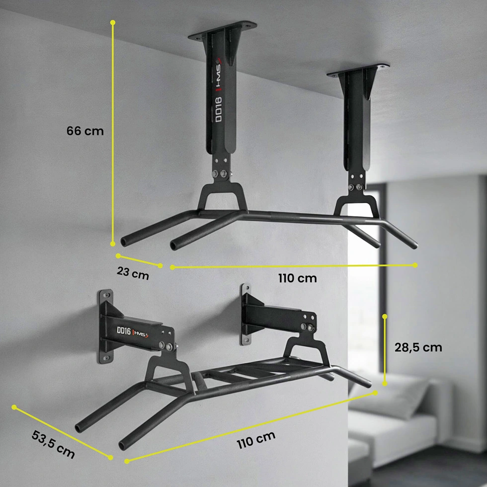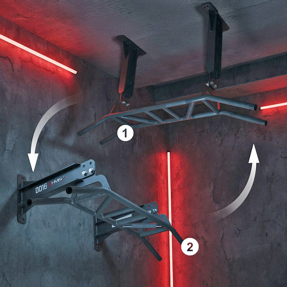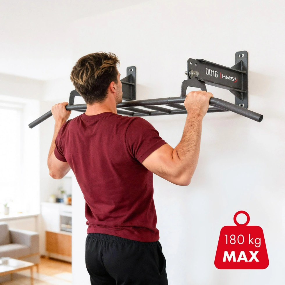 Stație pentru tracțiuni de la HMS. DD16 este o bară de tracțiuni pentru acasă, cu posibilitate de montare pe perete sau pe tavan. Acest format ajută la organizarea mai eficientă a spațiului de antrenament, inclusiv în încăperi mai mici. Utilizare: este potrivită pentru exerciții care vizează spatele, brațele, umerii, pieptul, precum și abdomenul și zona core. Poate fi folosită pentru tracțiuni clasice și exerciții suplimentare în antrenamente de forță și funcționale.