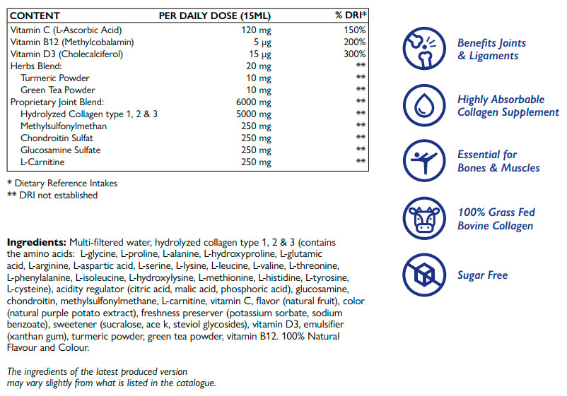 Apă multifiltrată, colagen hidrolizat tip 1, 2 & 3 (conține aminoacizi: L-glicină, L-prolină, L-alanină, L-hidroxiprolină, acid L-glutamic, L-arginină, acid L-aspartic, L-serină, L-lizină, L-leucină, L-valină, L-treonină, L-fenilalanină, L-izoleucină, L-hidroxilizină, L-metionină, L-histidin, L-tirozină, L-cisteină), regulator de aciditate (acid citric, acid malic, acid fosforic), glucozamină, condroitină, metilsulfonilmetan, L-carnitină, vitamina C, aromă (fructe naturale), culoare (extract natural de cartof violet), conservant de prospețime (sorbat de potasiu, benzoat de sodiu), îndulcitor (sucraloză, acesulfam de potasiu, steviol glicozide), vitamina D3, emulgator (gumă xantan), pulbere de turmeric, pulbere de ceai verde, vitamina B12.