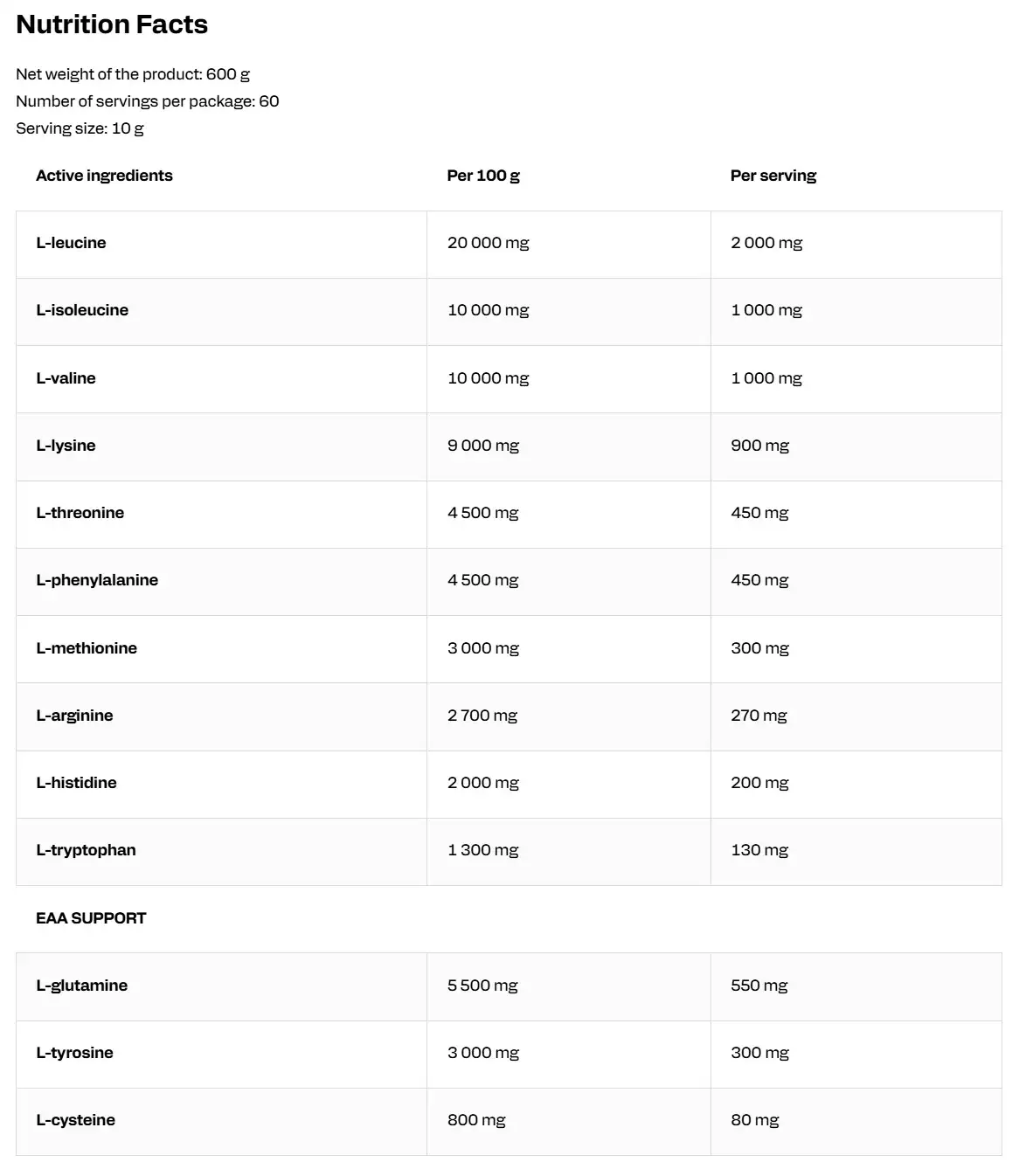 В основу продукта входят 10 незаменимых аминокислот. Поступают в ЖКТ с продуктами питания и пищевыми добавками. Необходимы для регенерации и развития тканей организма. При интенсивной физической нагрузке расход биологически активных веществ увеличивается. Организм нуждается в дополнительном поступлении незаменимых аминокислот.