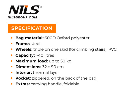 Практичное, лёгкое и прочное решение, которое облегчит ежедневные покупки и транспортировку различных грузов. Она идеально подходит не только для походов в магазин или на рынок, но и для пикников, поездок и путешествий – везде, где важны удобство и функциональность. Дорожная сумка оснащена прочной стальной рамой, обеспечивающей прочность и устойчивость даже при полной загрузке. Основное отделение изготовлено из износостойкого материала с высокой устойчивостью к влаге и грязи. Объём около 40 литров, что позволяет взять с собой большое количество покупок или необходимых вещей в дорогу.