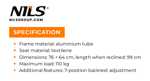 Сиденье изготовлено из высококачественного текстиля, который устойчив к погодным условиям, быстросохнет и дышащий, поэтому вы можете рассчитывать на тепловой комфорт даже в жаркие дни. Каркас изготовлен из прочной алюминиевой трубы, что гарантирует устойчивость и долговечность при небольшом весе. Конструкция позволяет безопасно использовать кресло с максимальной нагрузкой 110 кг.