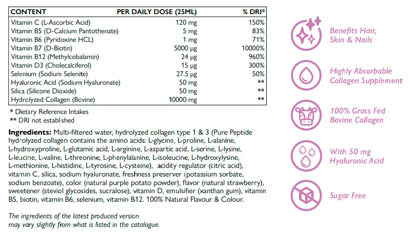 Мультифильтрованная вода, гидролизованный коллаген типа 1 & 3 (чистый пептид гидролизованного коллагена содержит аминокислоты: L-глицин, L-пролин, L-аланин, L-гидроксипролин, L-глутаминовая кислота, L-аргинин, L-аспарагиновая кислота, L-серин, L-лизин, L-лейцин, L-валин, L-треонин, L-фенилаланин, L-изолейцин, L-гидроксилизин, L-метионин, L-гистидин, L-тирозин, L-цистеин), регулятор кислотности (лимонная кислота), витамин C, кремний, гиалуронат натрия, консервант свежести (сорбат калия, бензоат натрия), цвет (натуральный порошок пурпурного картофеля), вкус (натуральная клубника), подсластитель (стевиол гликозиды, сукралоза), витамин D, эмульгатор (ксантановая камедь), витамин B5, биотин, витамин B6, селен, витамин B12.