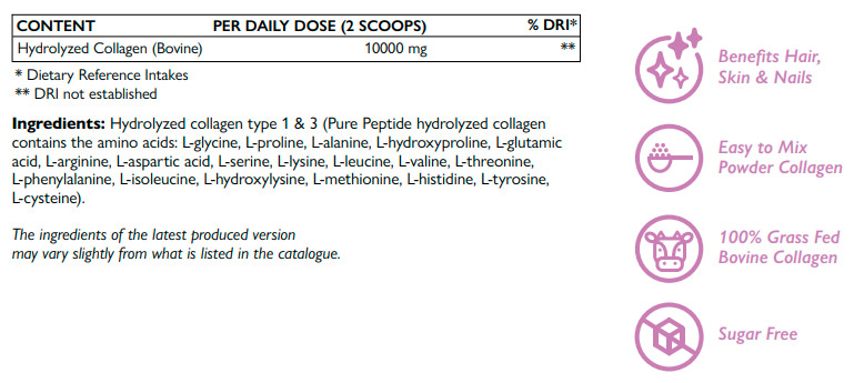 Гидролизованный коллаген тип 1 & 3 (чистые пептиды содержат аминокислоты: L-глицин, L-пролин, L-аланин, L-оксипролин, L-глутаминовая кислота, L-аргинин, L-аспарагиновая кислота, L-серин, L-лизин, L-лейцин, L-валин, L-треонин, L-фенилаланин, L-изолейцин, L-оксилизин, L-метионин, L-гистидин, L-тирозин, L-цистеин).